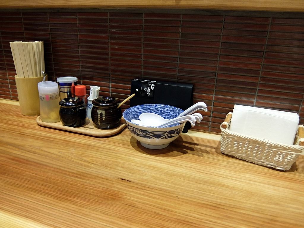 卓上調味料・薬味は、GABANホワイト&ブラックペッパー、一味唐辛子、レモン酢、おろしニンニク、揚げ玉ねぎ。
