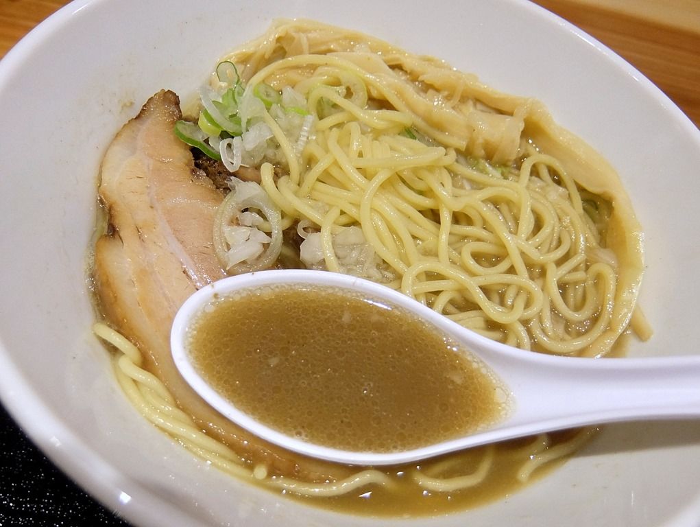 スープは、少しとろみのある煮干白湯醤油味。 茶濁で、いかにも煮干しが濃そうな色合い。