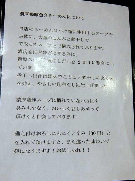 3ページ目、「濃厚鶏豚魚介らーめんについて」。