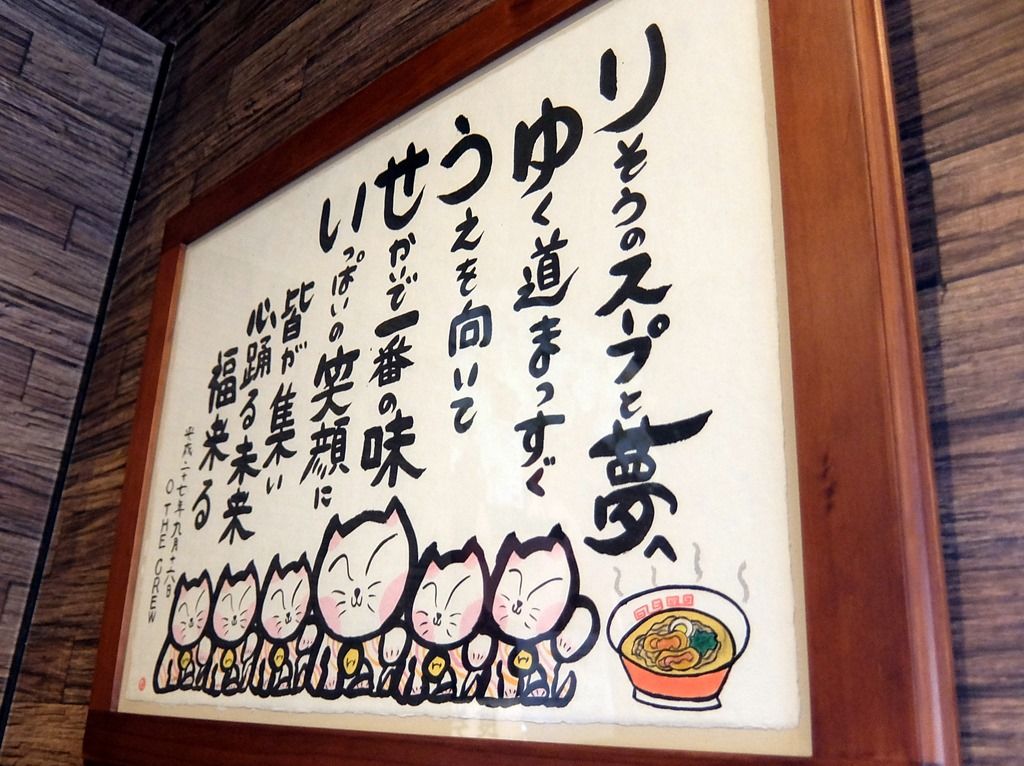 券売機横には、店名の一文字ずつを取って作った詩?がネコのかわいいイラスト付きでディスプレイされています。いいポエムじゃないすか!