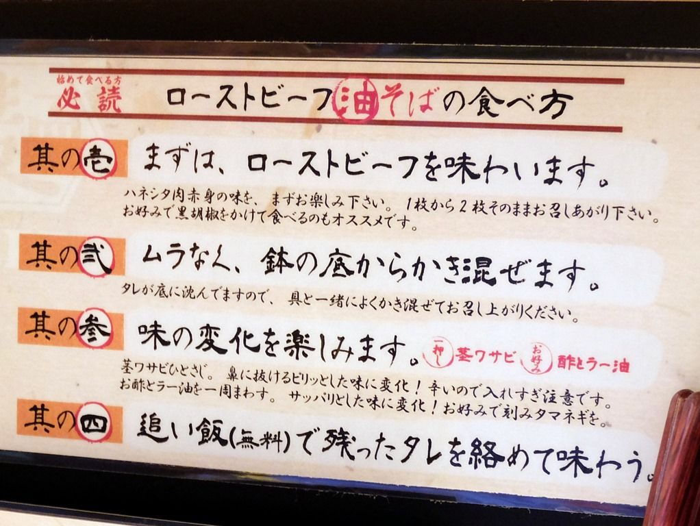 カウンターには、「ローストビーフ油そばの食べ方」掲示。