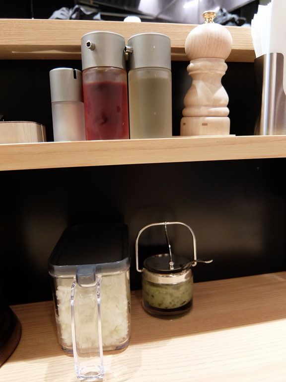 BGMは、J-Pop。箸は洗い箸でエコ対応。 卓上調味料は、ラー油、酢、ミル入り胡椒、きざみ玉ねぎ、茎わさび。