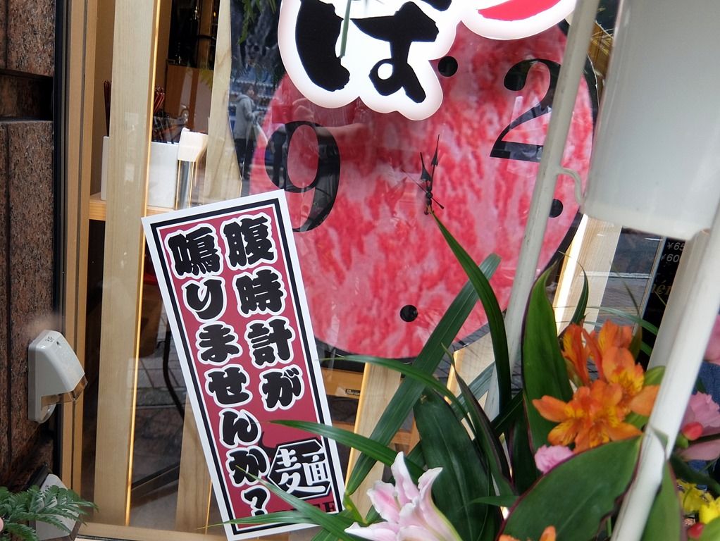 店頭に設置の時計は、なんと牛肉(^_^;) 添えられてるメッセージは、「腹時計がなりませんか?」w