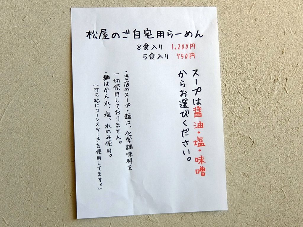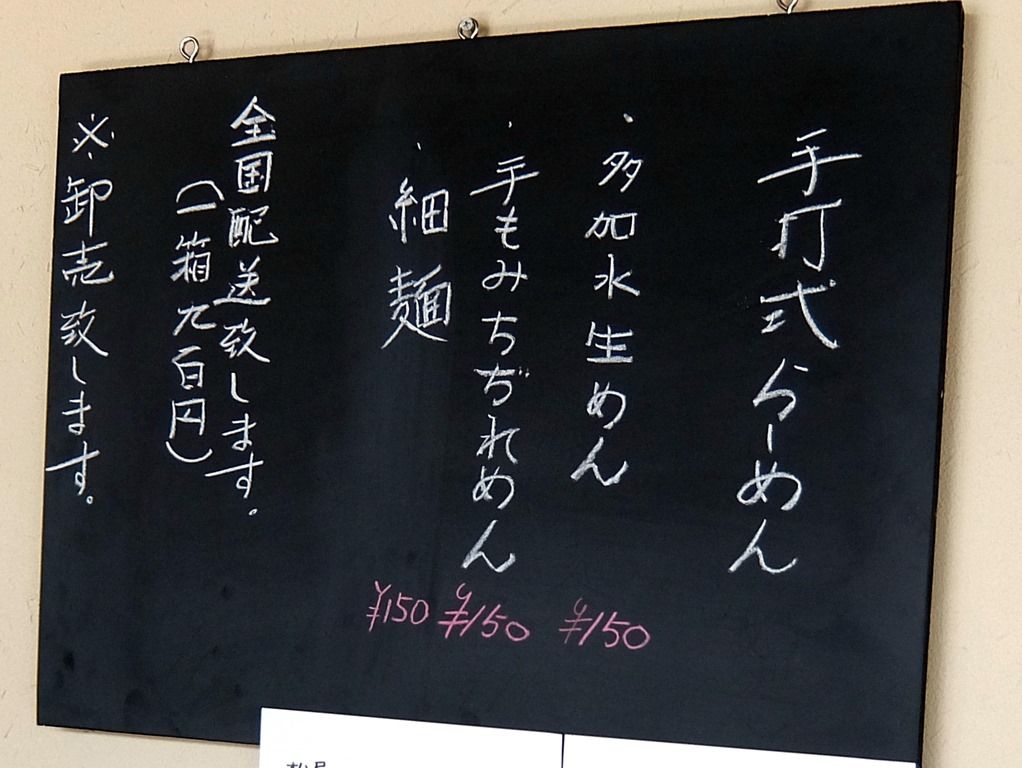 お土産らーめんは、多加水生麺150円、手もみ縮れ麺150円、細麺150円。