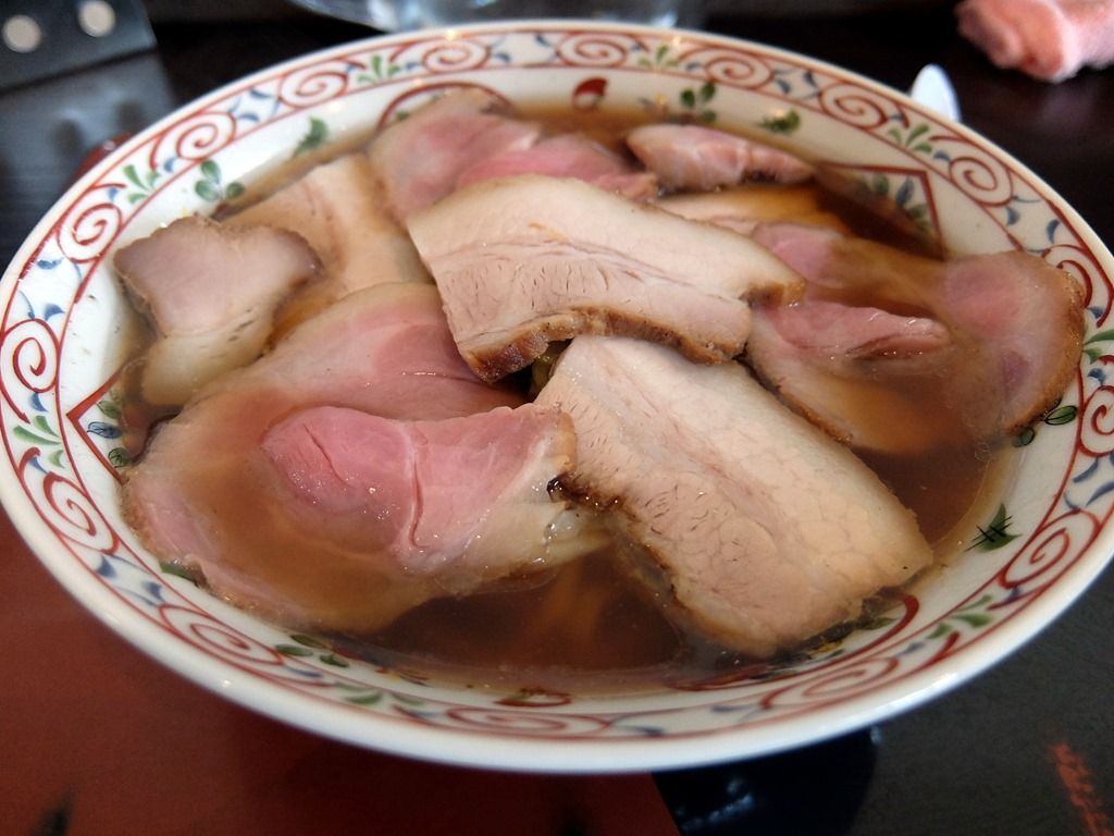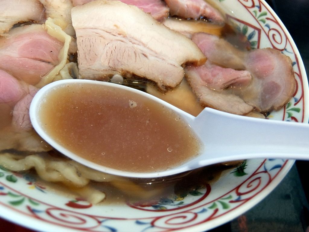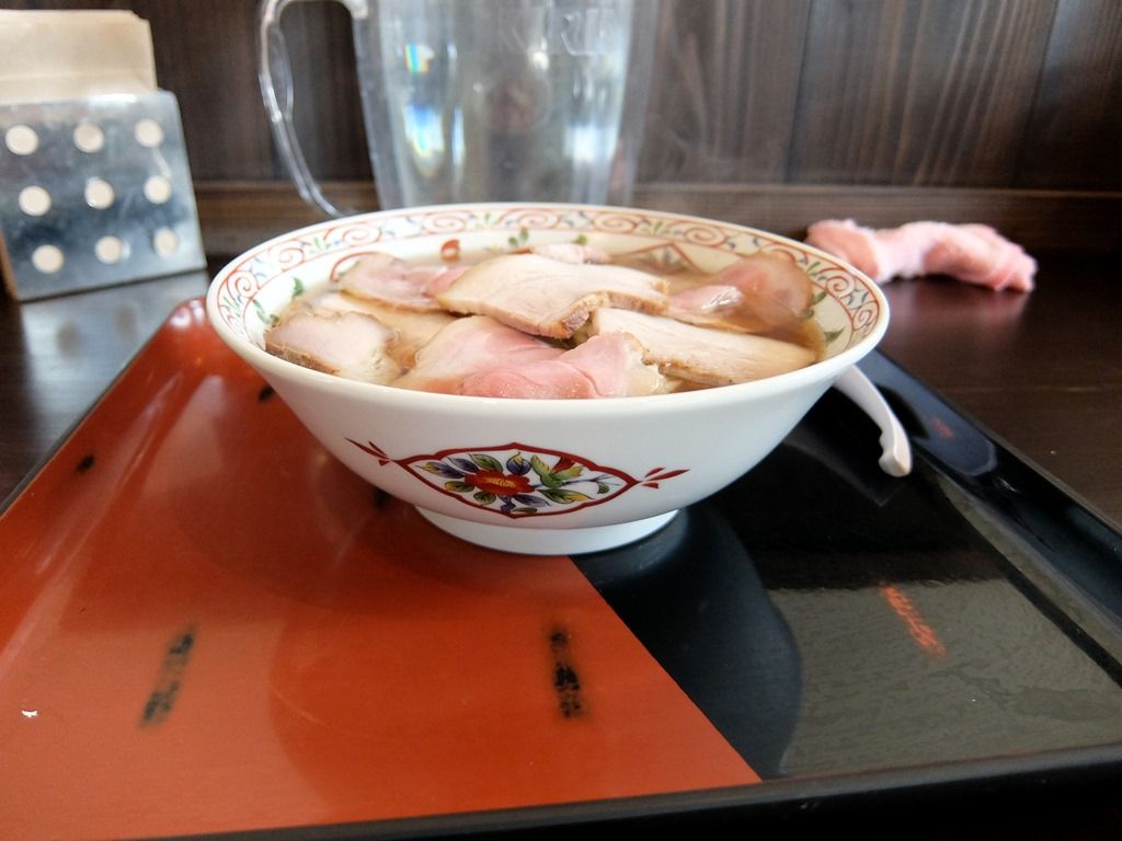 レンゲとともにトレーに載せられて供されます。 具は、たっぷりのチャーシュー、チャーシューの下にはネギ。チャーシューは部位の異なる2種類。肉厚でジューシーなのがバラ、低温調理のレアタイプが肩ロースかな!?