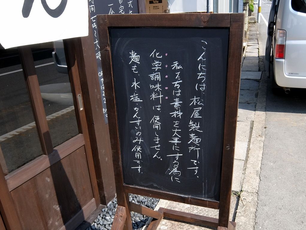 店頭立看板は、お店の紹介。化学調味料不使用、麺も水・塩・かんすいのみ使用。