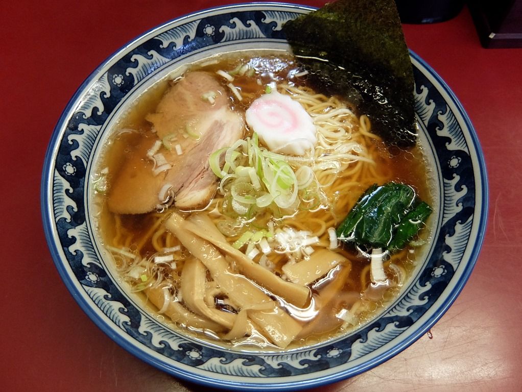 よく見かけるタイプの反高台丼で登場。 具は、海苔、チャーシュー、なると、メンマ、ほうれん草、きざみネギ。