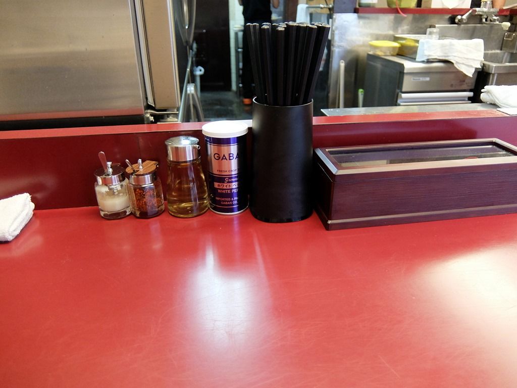 卓上調味料は、おろしにんにく?、辛味調味料、酢、GABANホワイトペッパー。