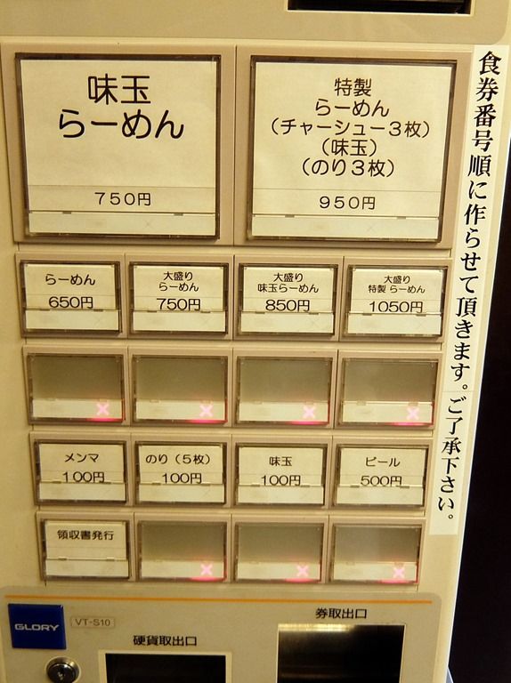 入店すると、まず券売機で食券購入です。 メニューは、らーめん650円が基本で、トッピングと大盛りのバリエーションのみ。ビール500円はありますが、ご飯類もないなんともシンプルで潔い構成。オーダーは、御品書き先頭の「らーめん」にしました。