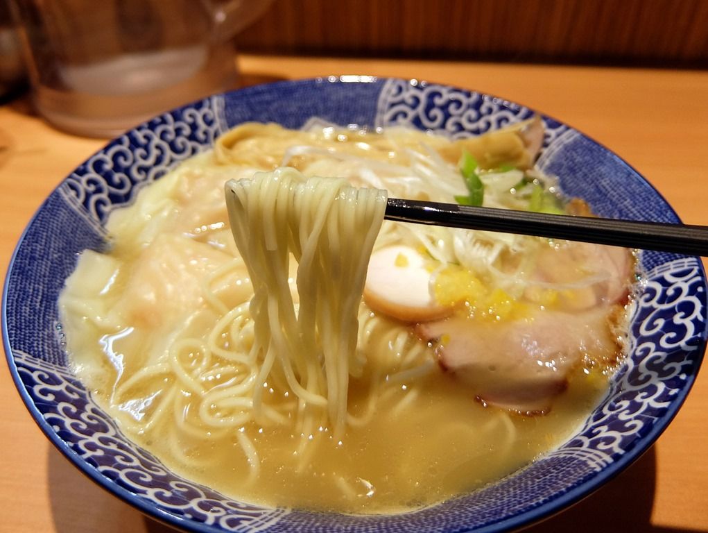 波をデザインしたかのような、ちょっと和の装いを感じる模様の反高台丼で登場。 武蔵出身という店主さんですが、俺麺山田の店主さんがやってらしたような、湯切り時の派手なアクションと威勢のよいかけ声はありません^^;