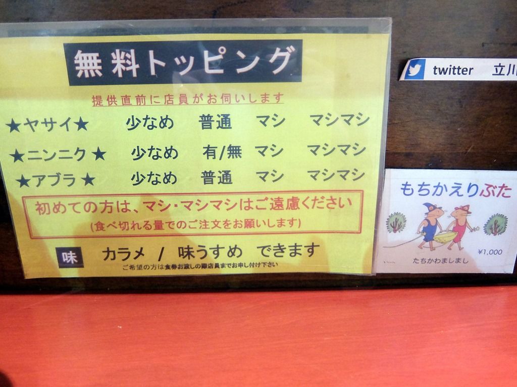 2015年9月1日オープン。立川たま館に本店、河辺店(秘密工場)、鶴川店(ロイヤルスープ)と支店拡大中の「立川マシマシ」の4号店。