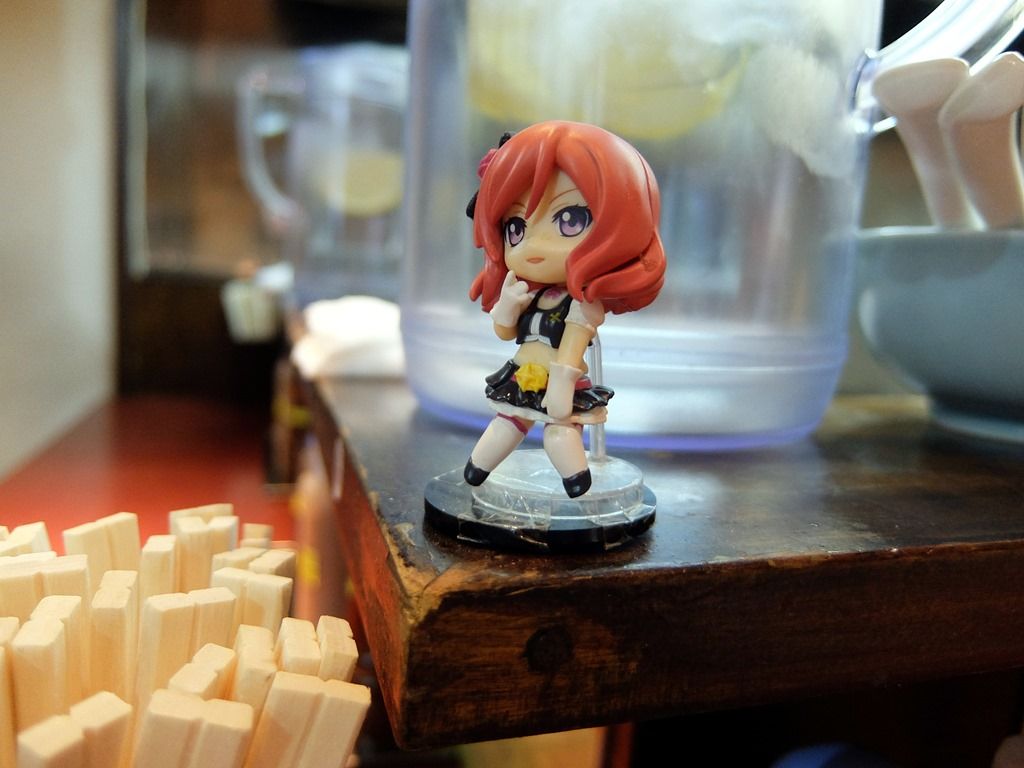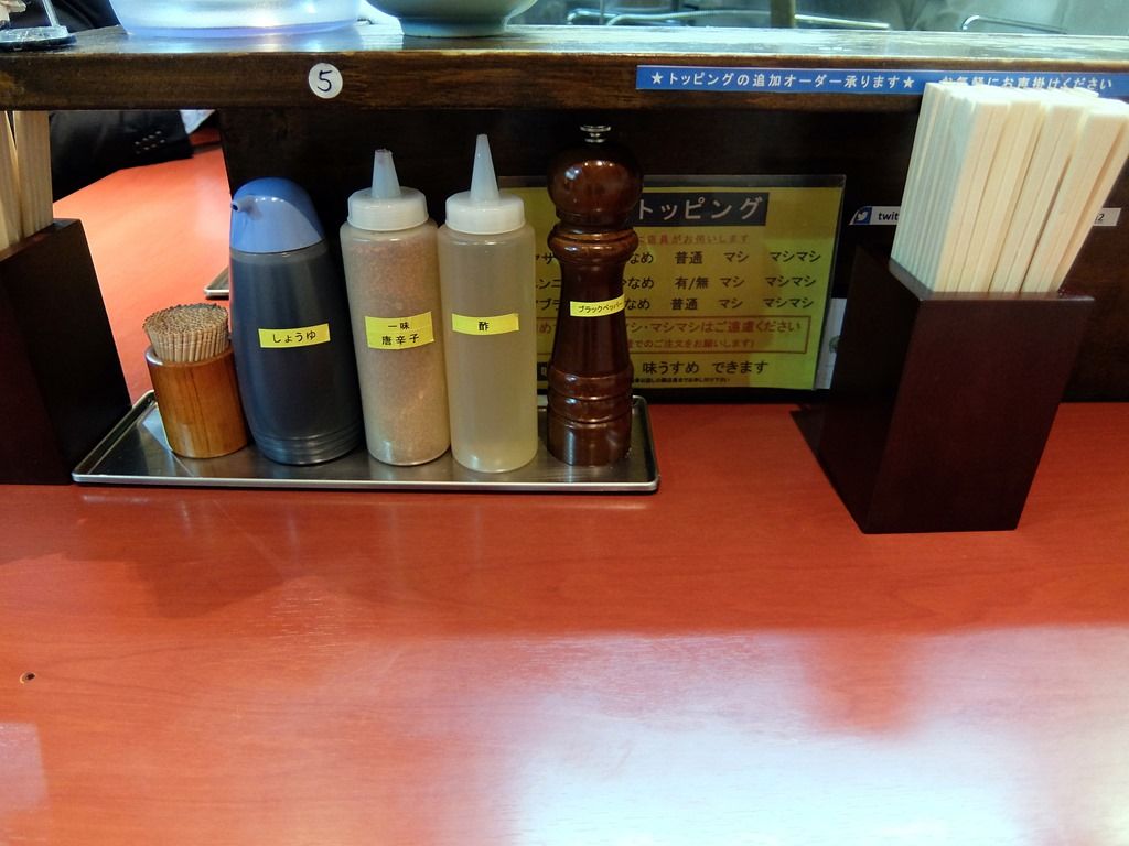 BGMは和製ロック。箸は割り箸。 卓上調味料は、しょうゆ、一味唐辛子、酢、ミリ入りブラックペッパー。