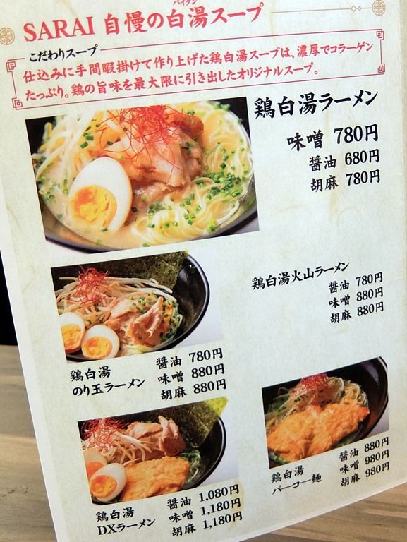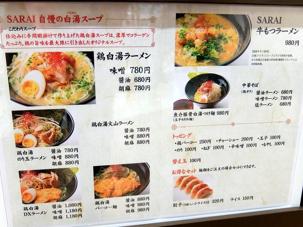 SARAI牛もつラーメン980円、中華そば醤油680円、味噌780円、塩680円、他。
