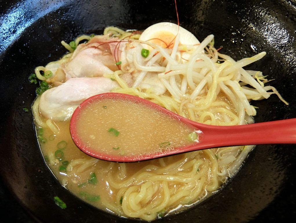 スープは、さらりとした鶏白湯味噌味。 クセの無いマイルドな鶏白湯にこれまたあっさりとした味噌ダレを合わせた、駅ビルラーメン店にふさわしい誰にでも好かれそうな味わい。