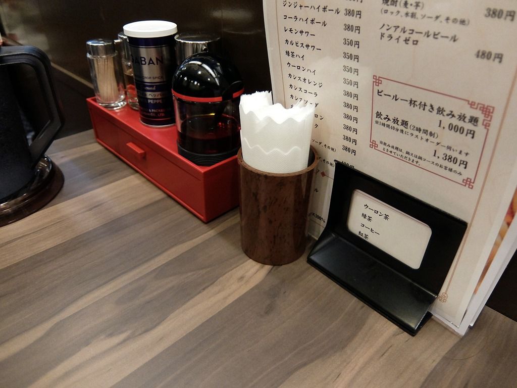 BGMは無し。箸は洗い箸でエコ対応。卓上調味料は、GABANブラックペッパー、醤油、酢、ラー油。