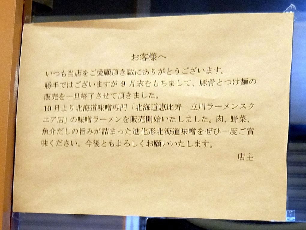 そう言えば立川本店では、リニューアル後に一部取り入れたという蔦亭の味を確認したくて、看板メニューの「味噌」ではなく「中華そば」を食べてました(^_^;)