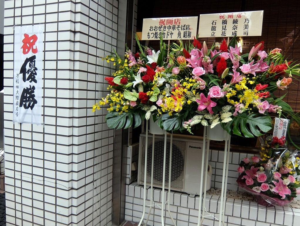 店頭には開店祝花。ラーメン関係では「桃星。」から。 オープン当日には、きっともっとたくさんの花が列ぶことでしょうね^^;