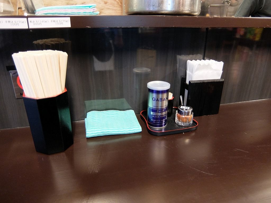 BGMはポップス。箸は割り箸。 卓上調味料は、GABANブラックペッパー、七味唐辛子。