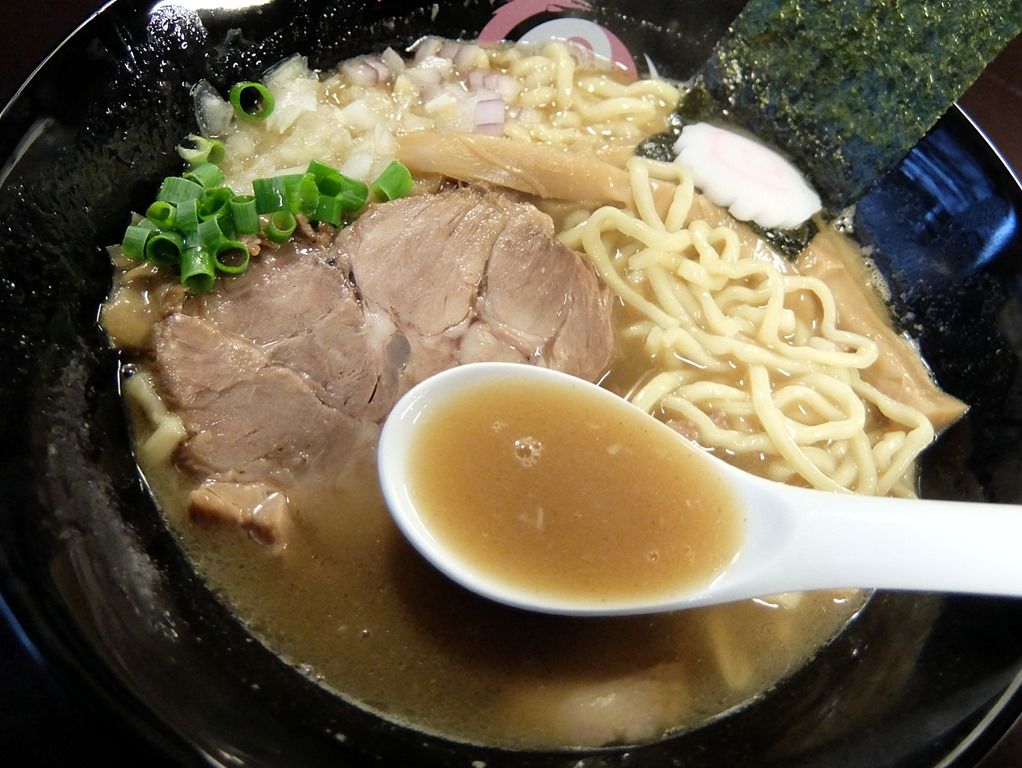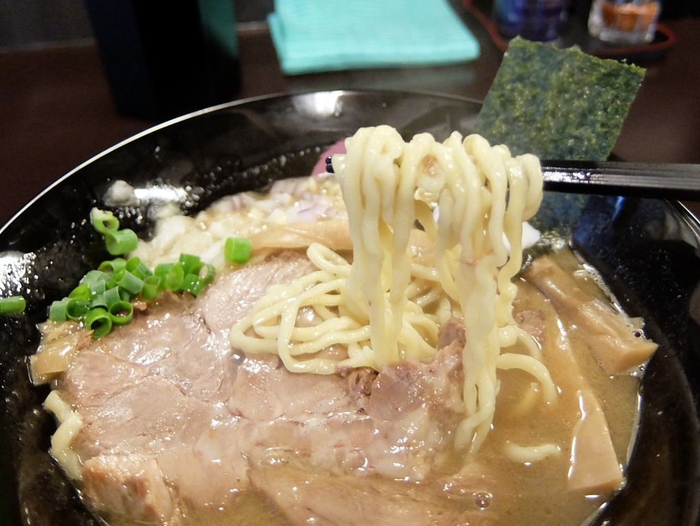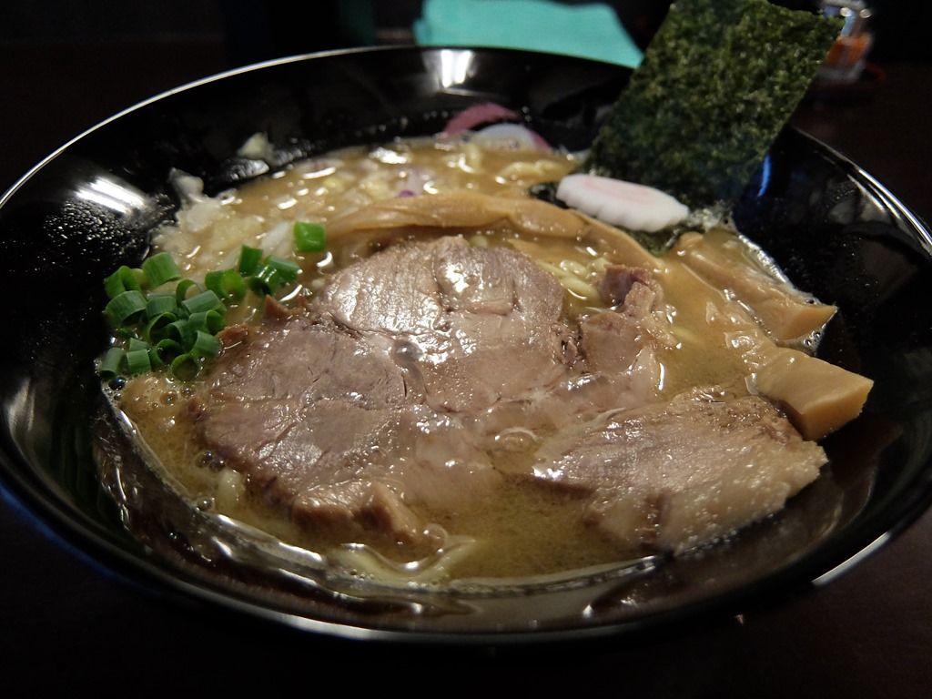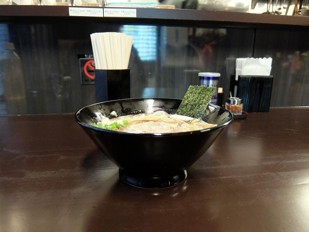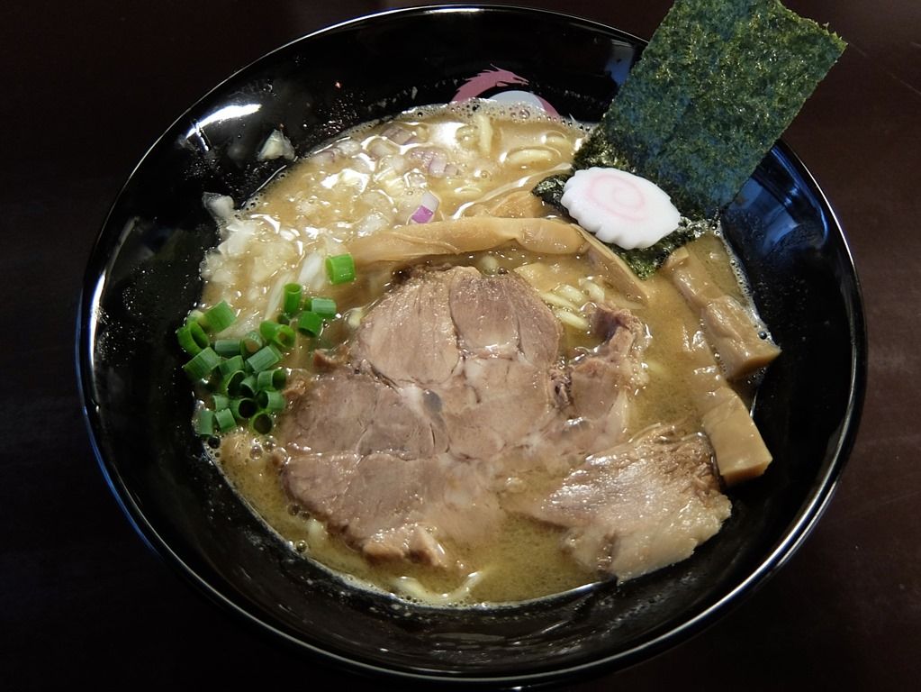 確か本店は、店名ロゴが入った白い丼だったと思いますが、こちらではやはりロゴ入りの黒い丼で登場。 具は、海苔、なると、穂先メンマ、チャーシュー、きざみネギ。