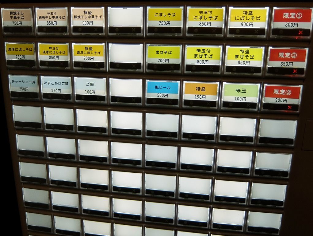 入店すると、まず券売機で食券購入です。 主なメニューは、鯛焼干し中華そば750円、濃厚にぼしそば759円、にぼしそば750円、まぜそば700円、チャーシュー丼250円、たまごかけご飯150円、他。