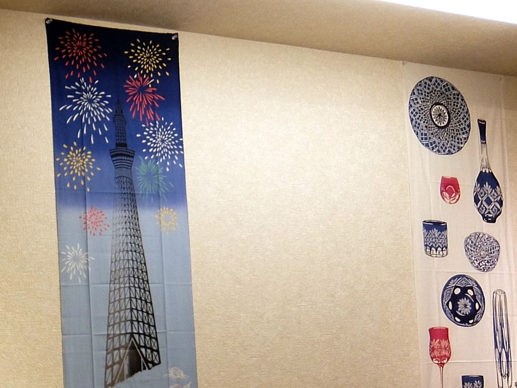 壁面には、和趣溢れる垂れ幕絵画がいくつもディスプレイされています。