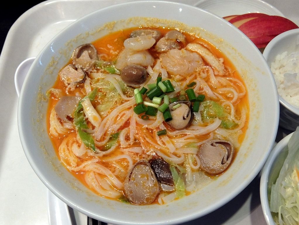 スープは、もちろん酸っぱいトムヤンクン。 ラー油みたいに赤い香油がかかっていますが、辛味はありません。