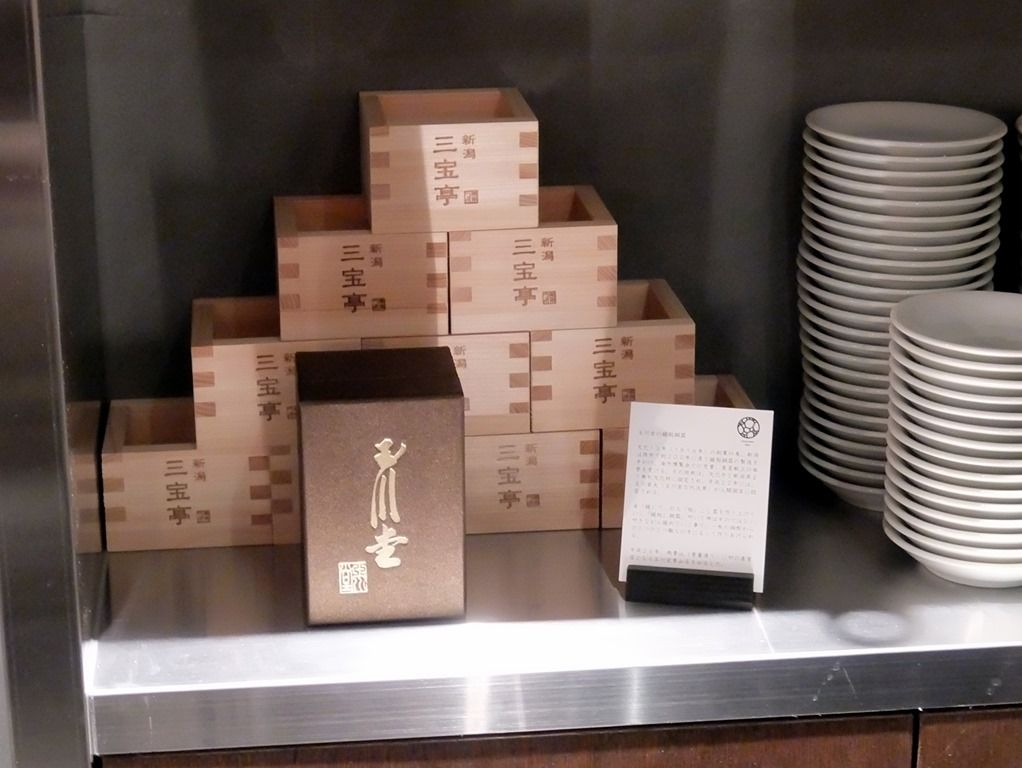 厨房の棚には、三宝亭のロゴ入り日本酒用升がありました。