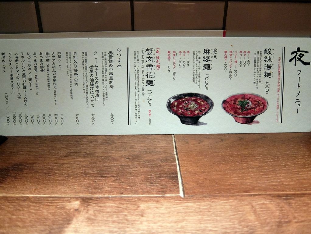 夜メニュー。夜は中華ダイニング的な営業でおつまみ豊富。ですが、酸辣湯麺・全とろ麻婆麺の価格が昼と同じなのは良心的。夜限定で、蟹肉雪華麺1280円ってのもあり。