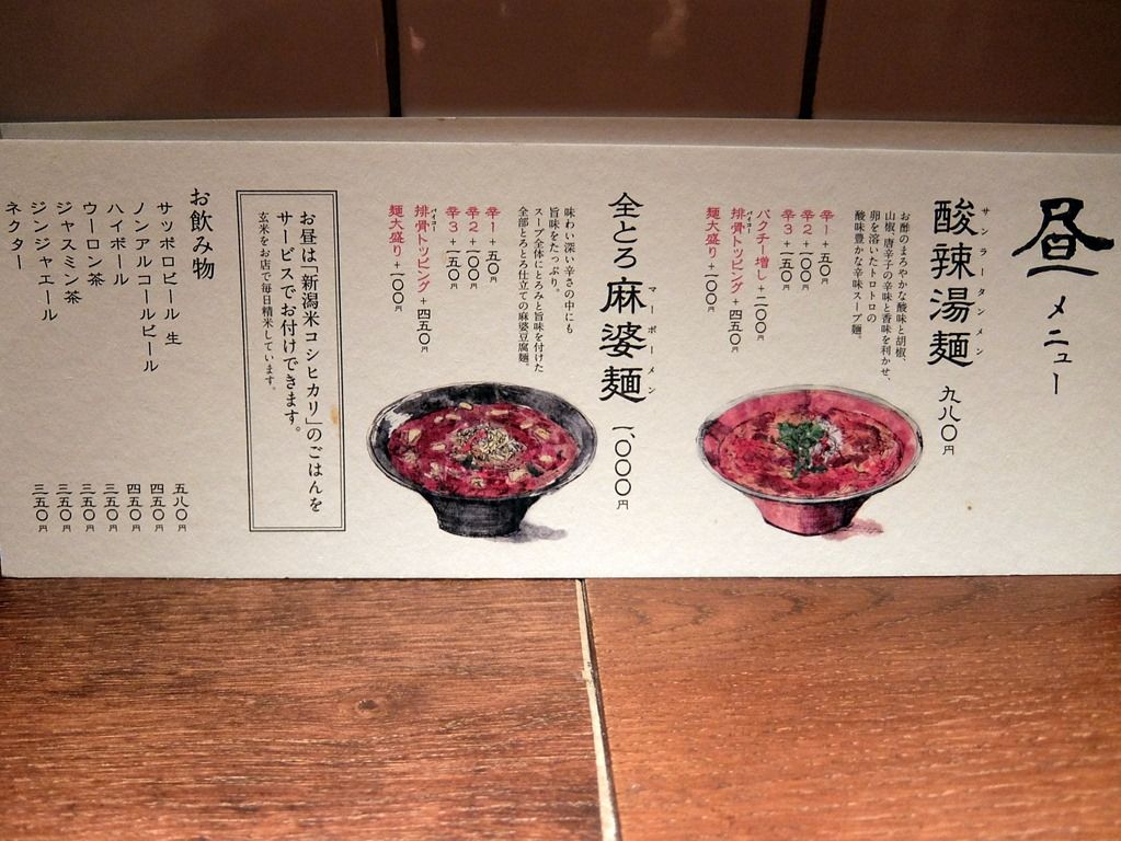 昼メニューは、酸辣湯麺980円、全とろ麻婆麺1000円の2種類にトッピングと麺大盛りのバリエーション。辛さは3辛まで増し可能で、+1辛毎に+50円。麺の他にはドリンクのみ。また、昼は、毎日店で玄米から精米した「新潟産コシヒカリ」のごはんサービスあり。