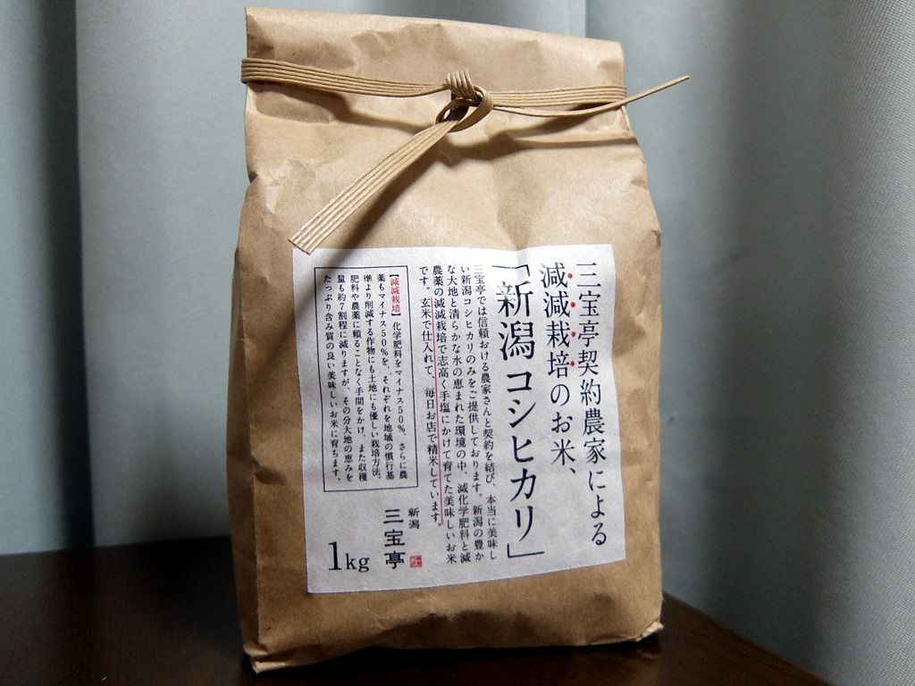 三宝亭契約農家による減減栽培の「新潟コシヒカリ」だそうです。 「減減栽培」って、化学肥料マイナス50%農薬マイナス50%の作物にも土地にも優しい農法とか。