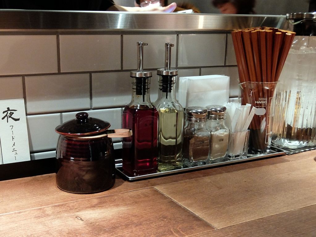 BGMは懐メロポップス、シンディ・ローパーとかw 箸は洗い箸でエコ対応。 卓上調味料は、ラー油、酢、山椒、胡椒。壺の中身はザーサイ、ライス用かな?