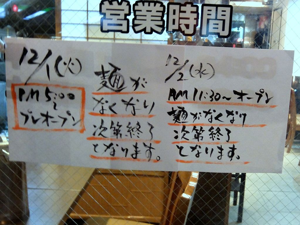 12/1は17:00~、12/2は11:30~、どちらも麺がなくなり次第終了。 ってことで、この日遅い時間まで材料切れにならなかったのは、ラッキー!