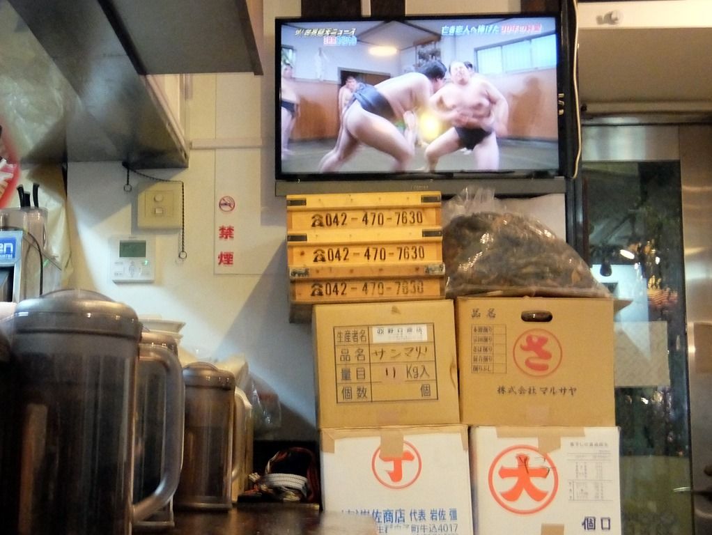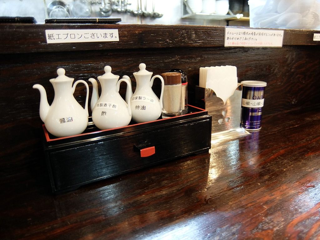 BGMはテレビ。箸は洗い箸でエコ対応。 卓上調味料は、醤油、特製煮干酢、自家製辣油。