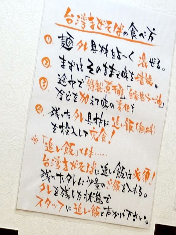 壁面には、「台湾まぜそば」の食べ方掲示。 「台湾まぜそば」は無料の追い飯付き。