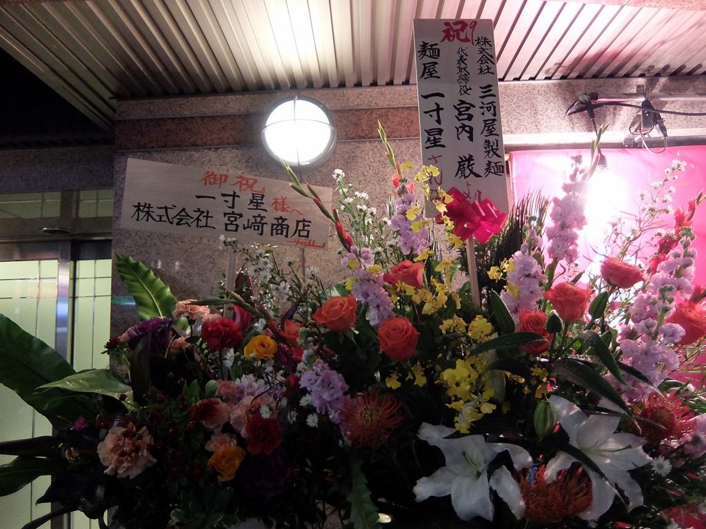 店頭には開店祝花。 既知の所では、三河屋製麺からの花がありました。