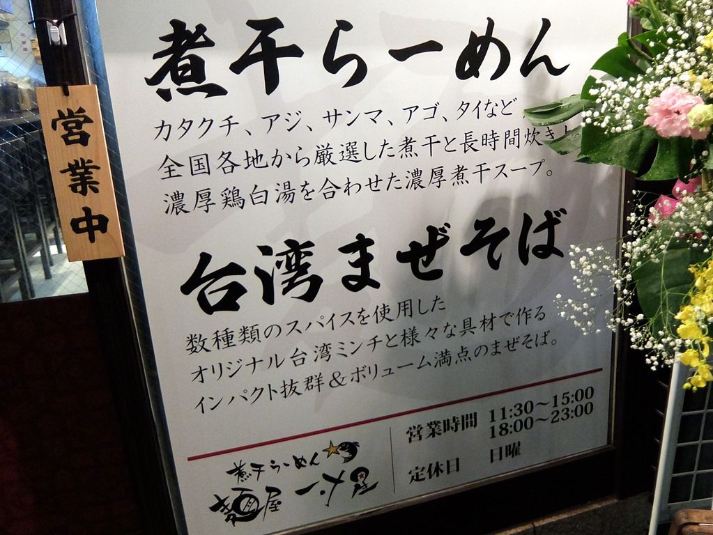 店頭ボードには、二枚看板である煮干らーめんと台湾まぜそばの説明。