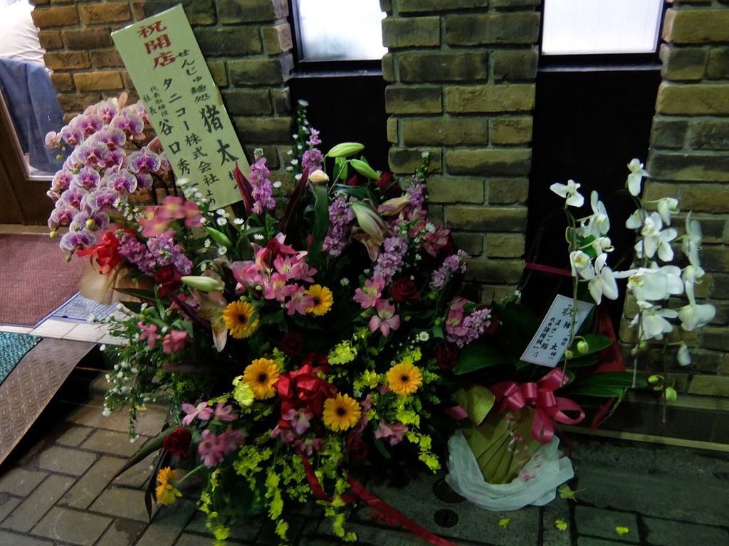 店頭には開店祝花。 背の高い花台もあったみたいですが、強風のため片付けられた模様。小さな花だけが残っていました。