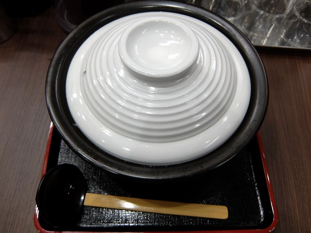 土鍋は熱々で触ると危険(^_^;) なので、トレーに鍋敷き用の網に木製レンゲと共に載って登場。