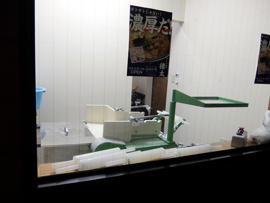 入口向かって左手店舗端は、外からガラス張りで見える製麺室。中には製麺機が鎮座。
