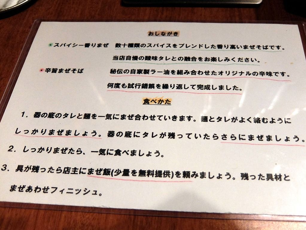 どっちにしようかだいぶ迷って、オーダーは「旨辛まぜそば」にしました。メニュー裏は、まぜそばの食べ方。