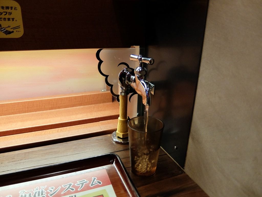 お冷は手元の水道からセルフで。 画像では手を離して水を注いでますが、コップを置けば自動で水が流れてくるわけではありませんw