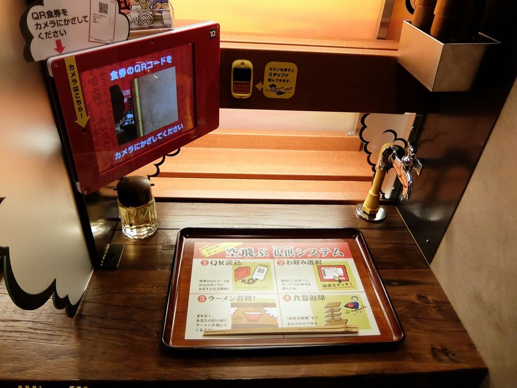 トレーには、洗い箸と「空飛ぶラーメン提供システム」の説明あり。 1.券売機で購入した食券のQRコードをiPadのカメラに読み込ませる