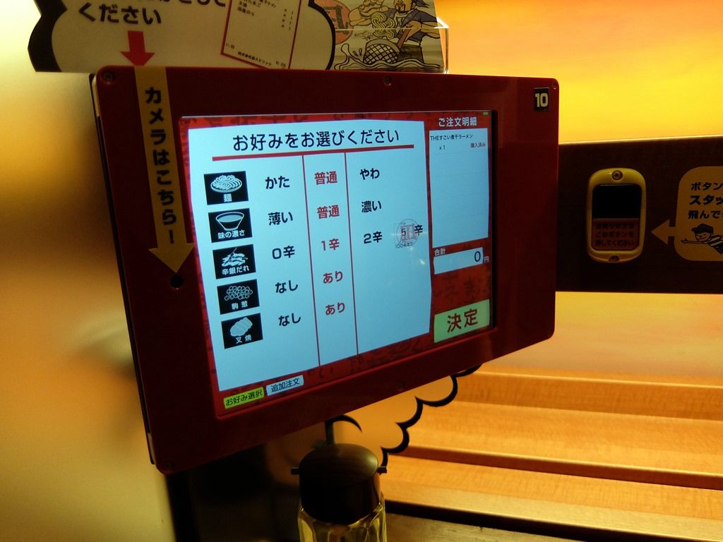 次にタッチパネルで、麺の固さ、味の濃さ、辛さ、ネギの有無、チャーシューの有無を選択します。