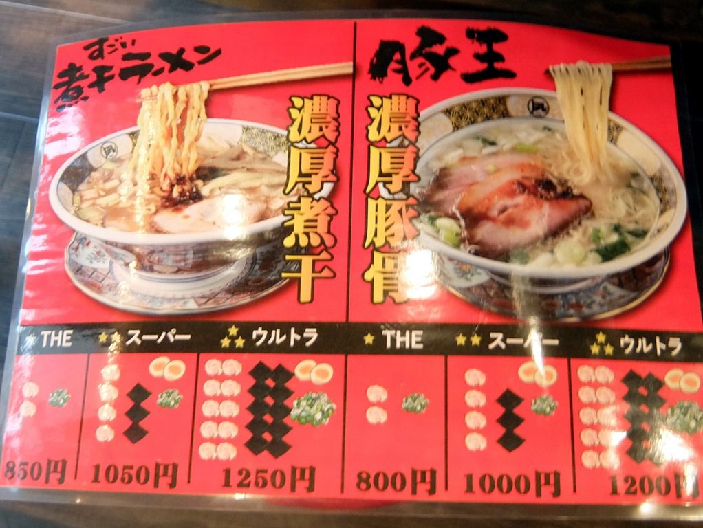 主なメニューは、THEすごい煮干ラーメン850円、THE豚王800円、スーパ+200円、ウルトラ+400円、他。オーダーは、「THEすごい煮干ラーメン」にしました。