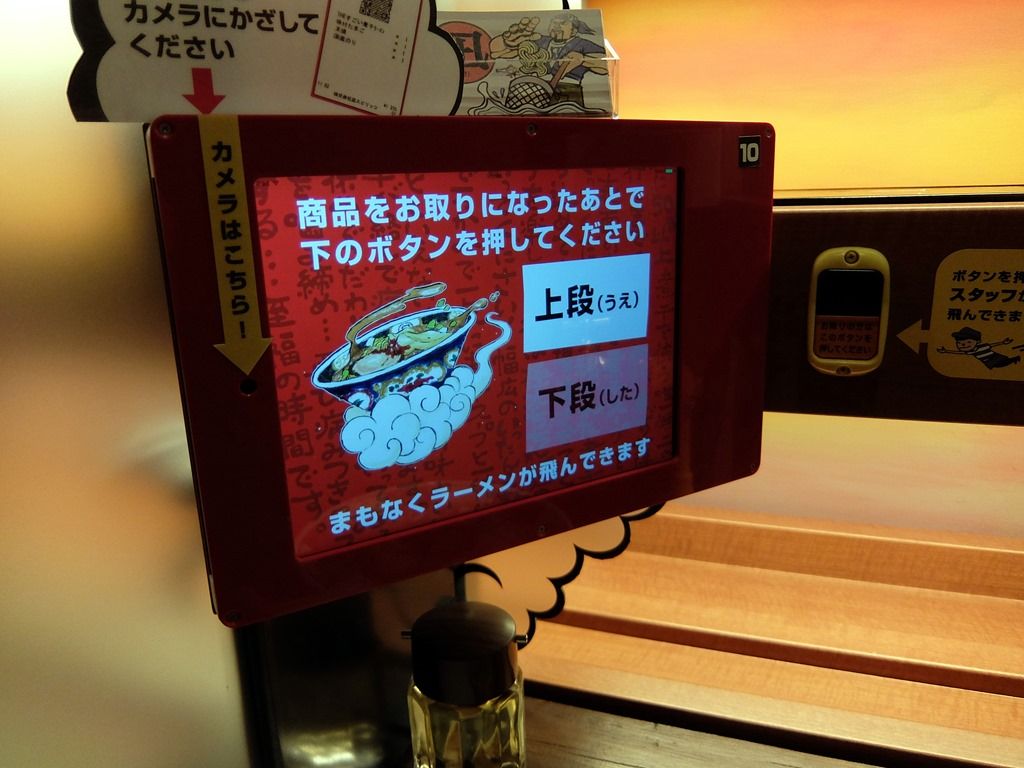 レーンからラーメンを受け取ったラ、上段か下談のボタンをタッチします。 これがちょっと麺倒で、酔客とかラーメン受け取ってからのボタン押し忘れが頻発しそう(´・ω・`)