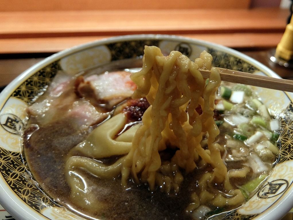スープは、さらりとした煮干醤油味。チョコレート色したスープは20種類以上の煮干しを一杯に60g以上使用とのことで、煮干しマックスな味わい。 「すごい煮干ラーメン」は食べるたびに味が進化してますが、今回は煮干しの効きがシャープでソリッド。