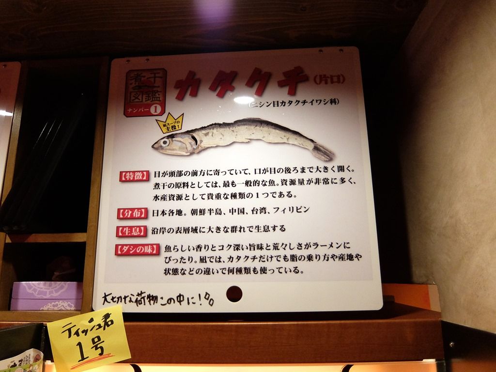 各席の上には、煮干の解説掲示。 スープに20種類以上の産地の異なる煮し干を使用とのことで、煮干の説明も多数。