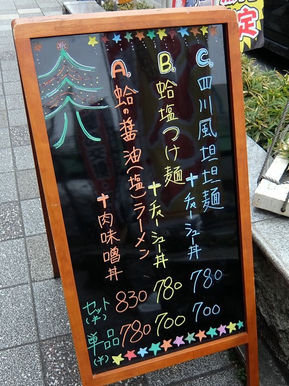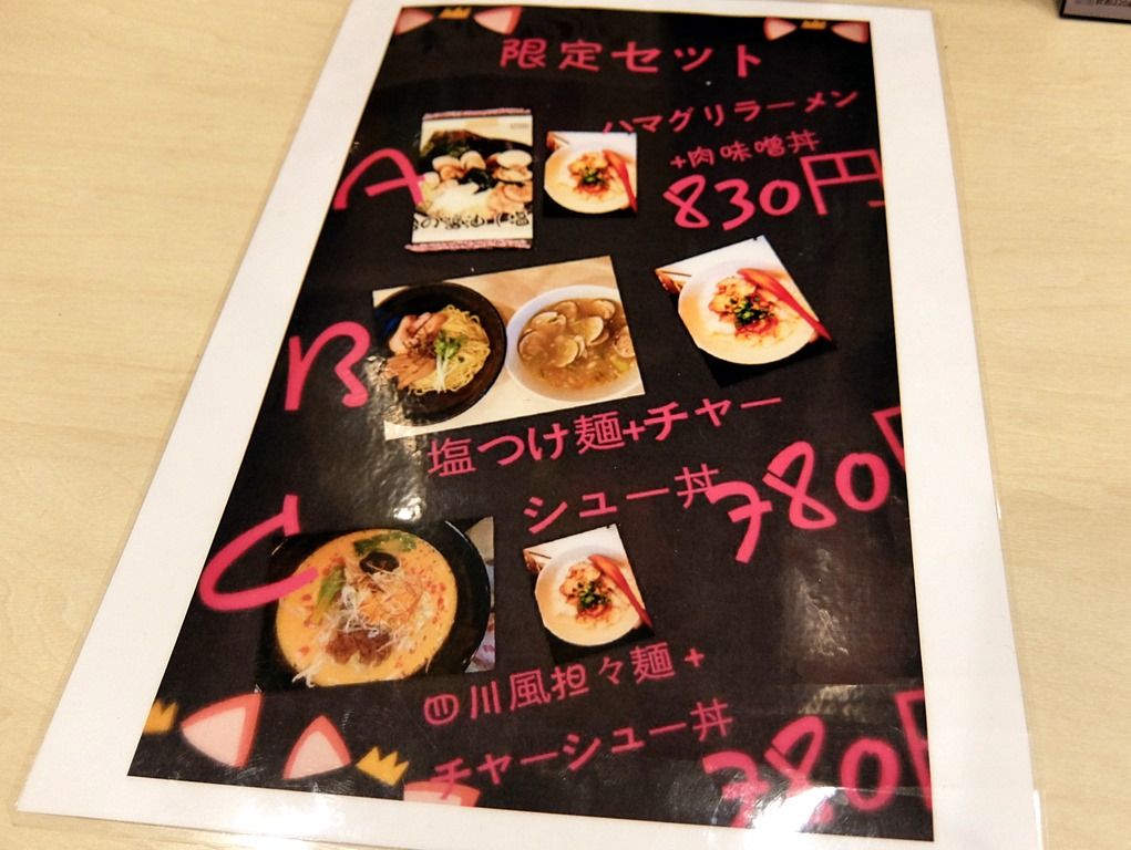 丼のセットが激安で、蛤の醤油・塩ラーメン+肉味噌丼830円、B.蛤塩つけ麺+チャーシュー丼780円、四川風坦々麺+チャーシュー丼780円。 ランチ限定か不明ですが+50円~+80円と実にお得。