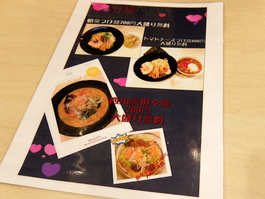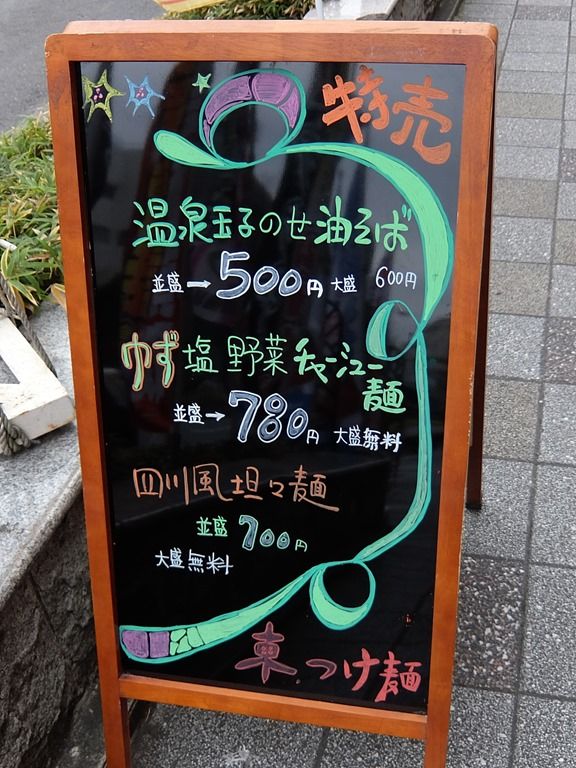 期間限定は、温泉玉子のせ油そば500円、ゆず塩野菜チャーシュー麺780円、四川風坦々麺700円。 限定麺も、ラーメンは大盛り無料。