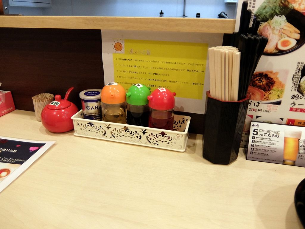 BGMはTBSラジオ。箸は、洗い箸と割り箸のW装備。 卓上調味料は、自家製辛味調味料、GABANコショー、酢、醤油、ラー油。